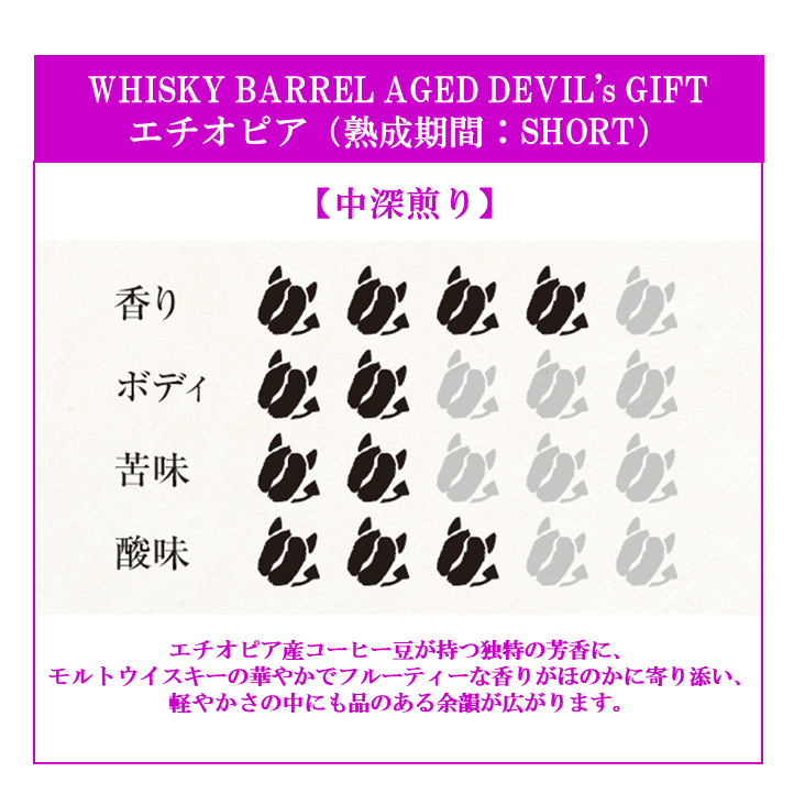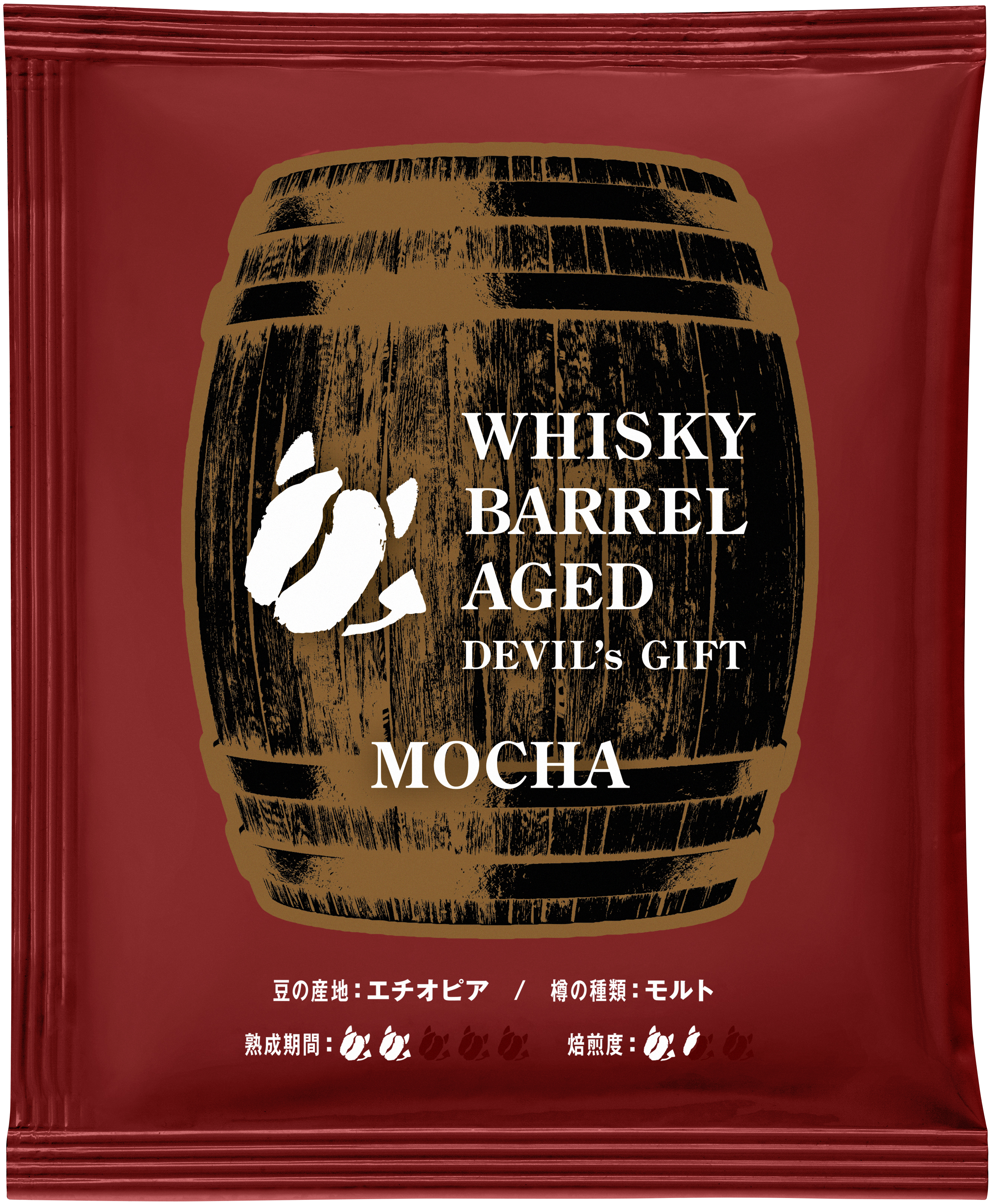 - 『WHISKY BARREL AGED DEVIL’s GIFT』は、ドリップする際に立ち上る豊かな香りと、樽での熟成がもたらす複層的な味わいが特長のコーヒー豆です。ウイスキーの熟成樽に、コーヒー生豆を入れて、じっくり熟成させることで、コーヒー豆に香りが移り、さらに焙煎することで豊かな香りが楽しめるコーヒーに仕上がります。コーヒー豆は、独特の香りとフルーティーで甘いコクのある味わいが特徴で、日本で人気のあるエチオピア産を採用しました。