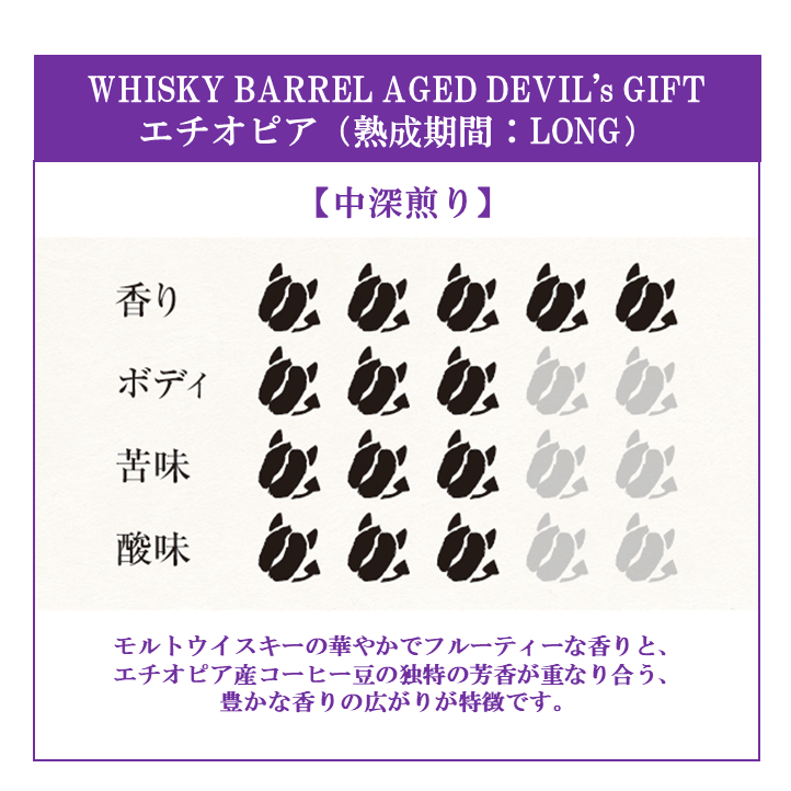 - 『WHISKY BARREL AGED DEVIL’s GIFT』は、ドリップする際に立ち上る豊かな香りと、樽での熟成がもたらす複層的な味わいが特長のコーヒー豆です。ウイスキーの熟成樽に、コーヒー生豆を入れて、じっくり熟成させることで、コーヒー豆に香りが移り、さらに焙煎することで豊かな香りが楽しめるコーヒーに仕上がります。コーヒー豆は、独特の香りとフルーティーで甘いコクのある味わいが特徴で、日本で人気のあるエチオピア産を採用しました。